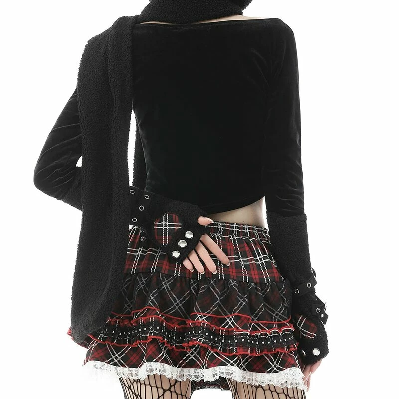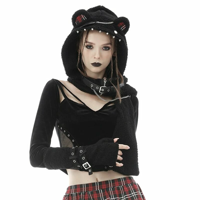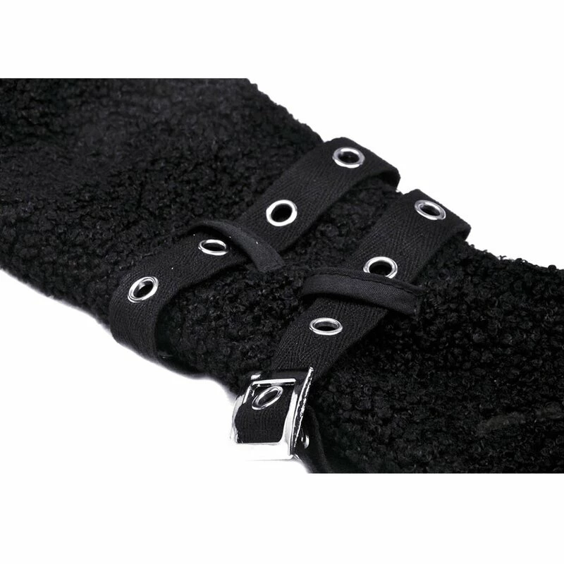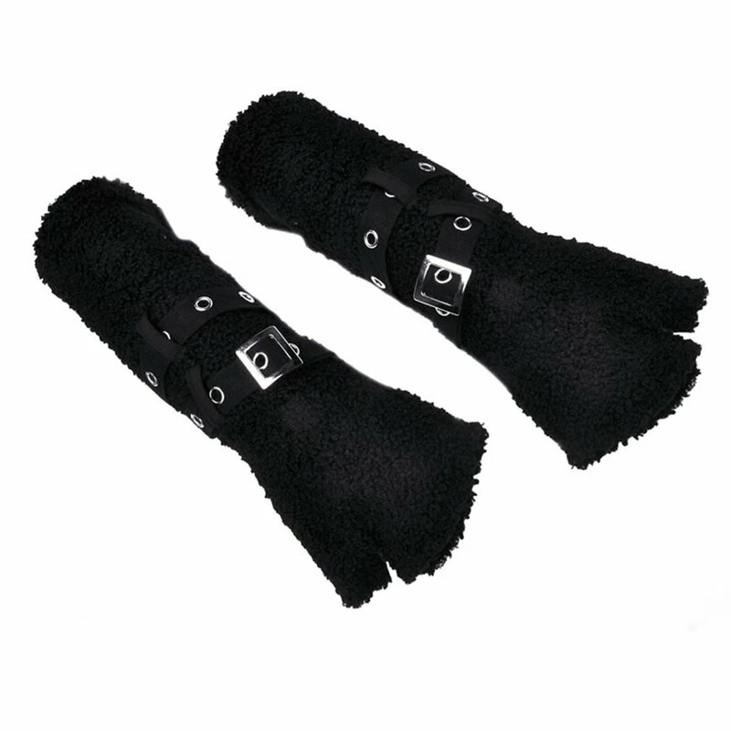 Dark In Loves Fluffy Cat Handschuhe sind aus extra flauschigem Fleece. Sie haben Pfotenmarkierungen in der Form eines tartangemusterten Herzens und drei Flachnieten. Am Handgelenk haben sie verstellbare Riemen.