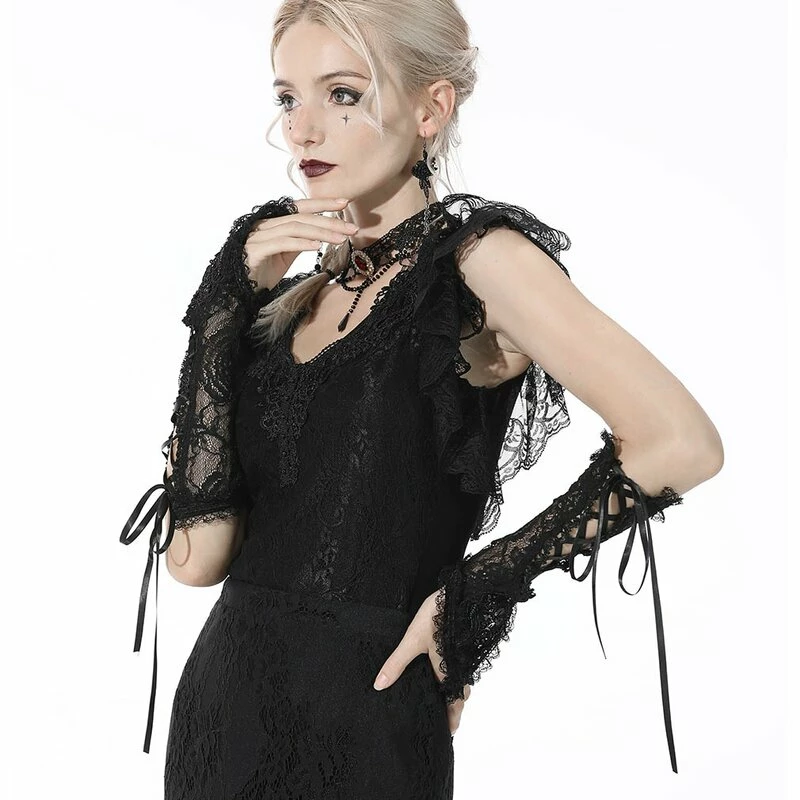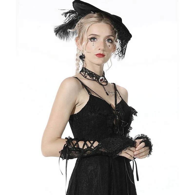 Dark In Loves Maire Handschuhe sind lange Opernhandschuhe aus feiner Spitze mit gerüschter Bordüre und schwarzen Kunstperlen. Sie haben lange Schnürungen mit Satinschleifen.