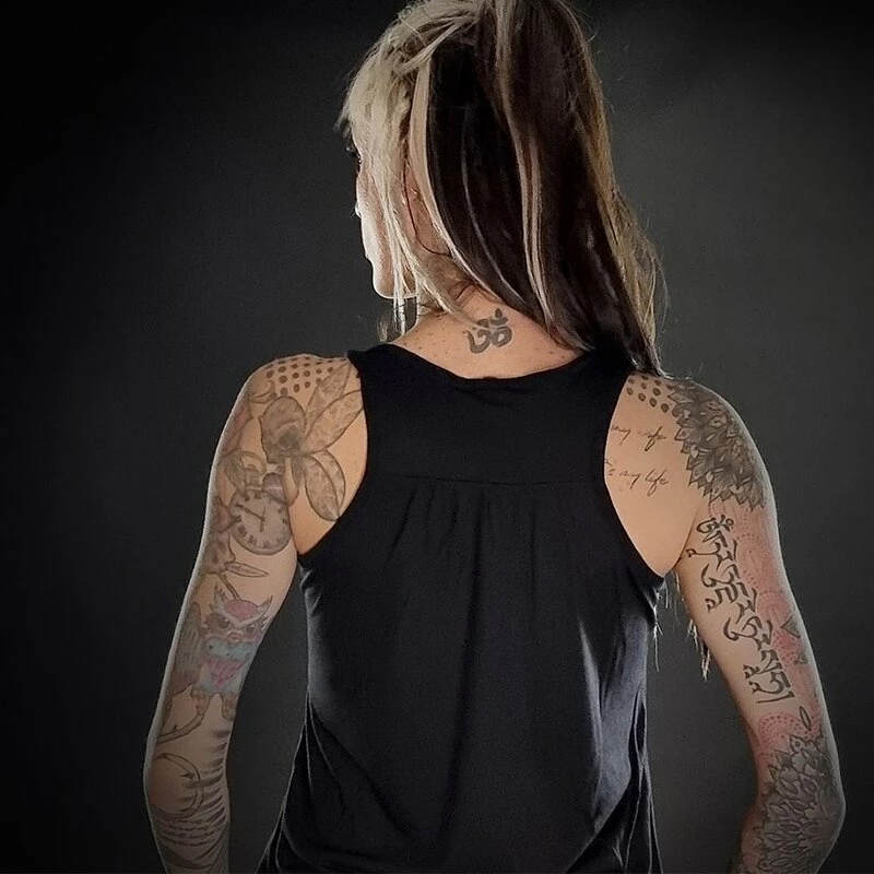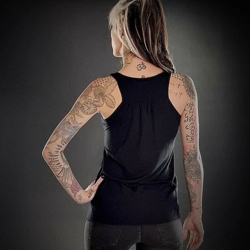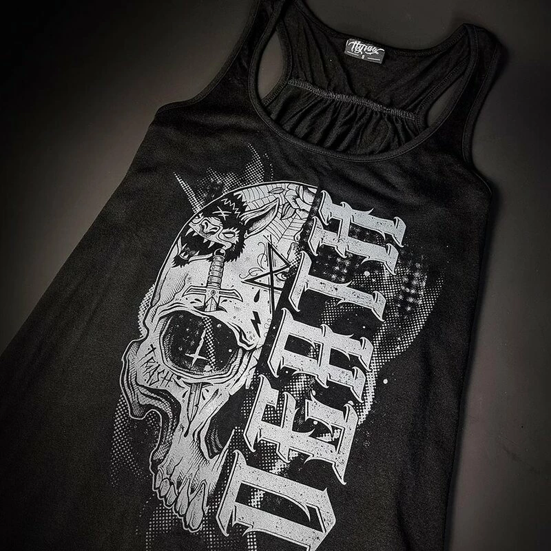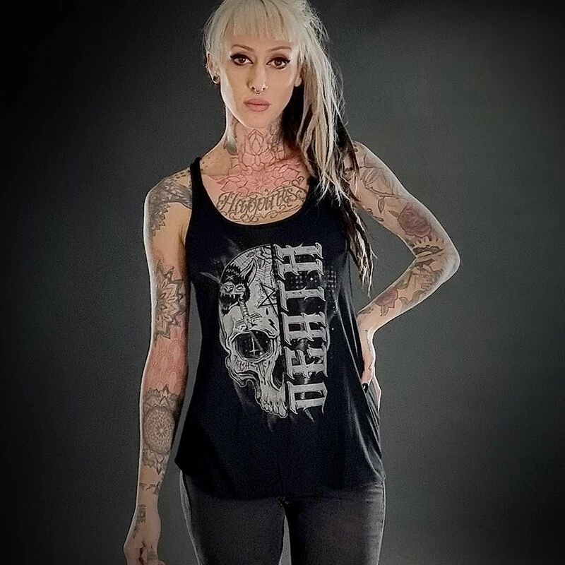 Punkiger Tank Top von Hyraw. Der Death Top hat einen Print eines tätowierten Schädels mit großem “Death” Schriftzug.