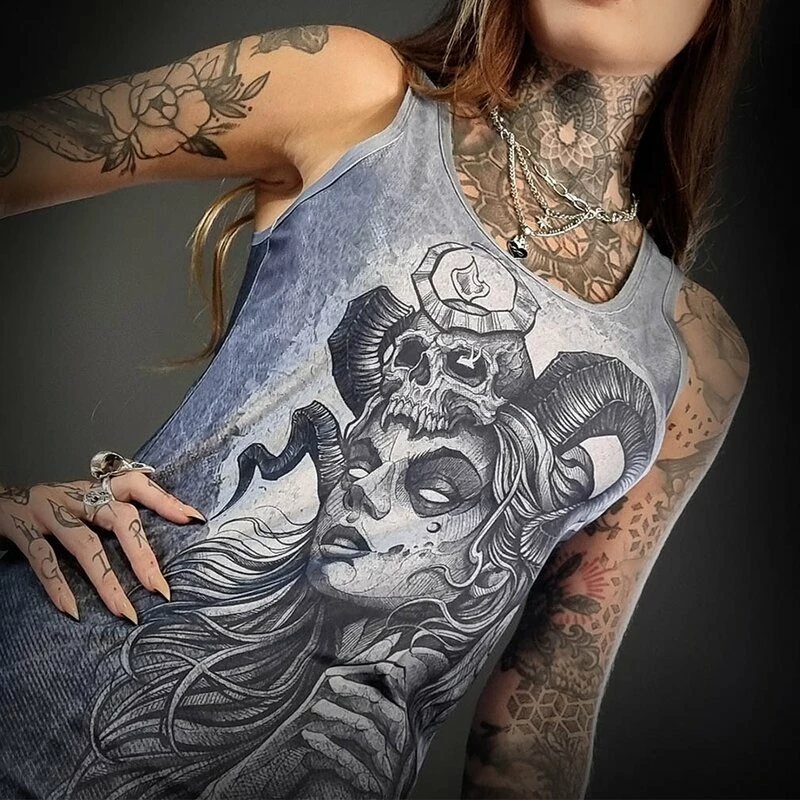 Punkiger Tank Top von Hyraw. Der Succuba II Top hat einen Print eines düsteren Succubus.