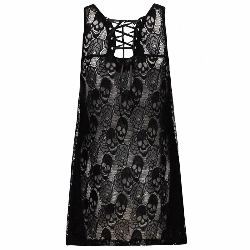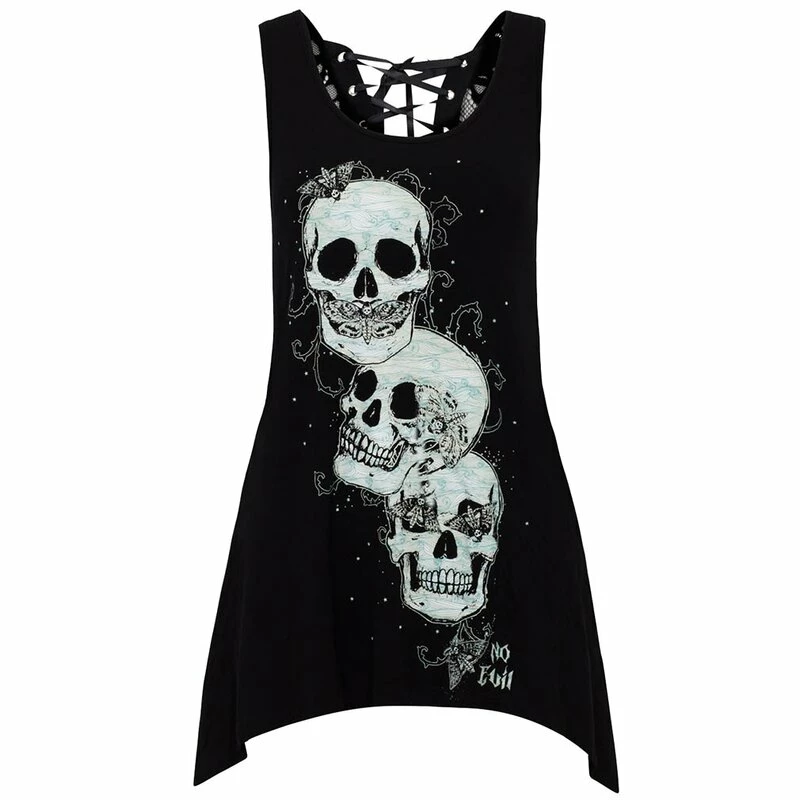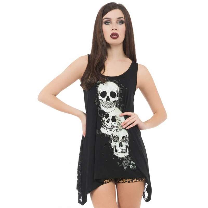 Speak no evil, hear no evil, see no evil. Jawbreakers Do No Evil Top liefert eine Gothversion des bekannten Affenbildes, in der Form von drei Schädeln und Motten die Mond, Ohr und Augen bedecken. Der Rücken ist komplett aus durchsichtiger Spitze mit Schädel Muster.