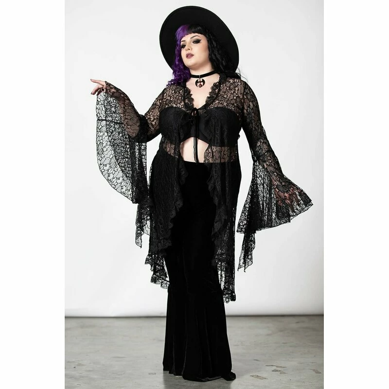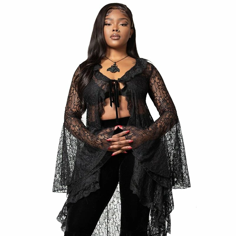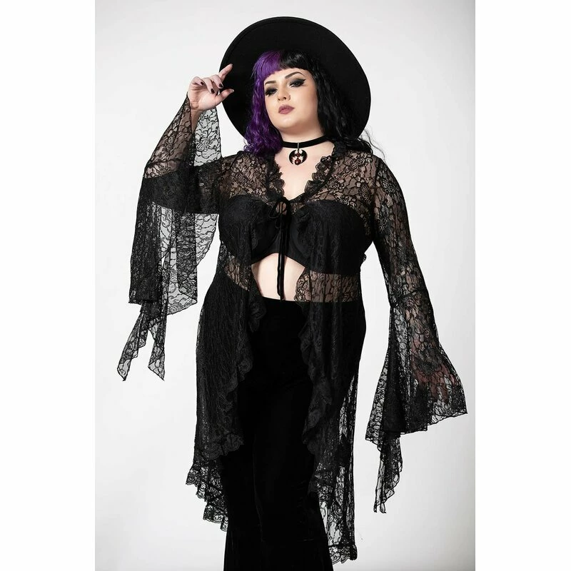 Killstars Vilania Duster ist aus feiner Spitze mit einem edlen Blumenmuster. Der Duster hat vorne an der Brust eine kleine Schnürung als Verschluss. Er hat gerüschte Bordüre und extra weite Wasserfallärmel.