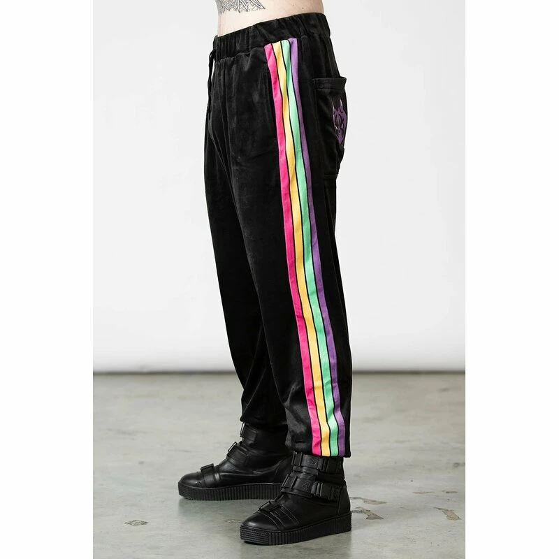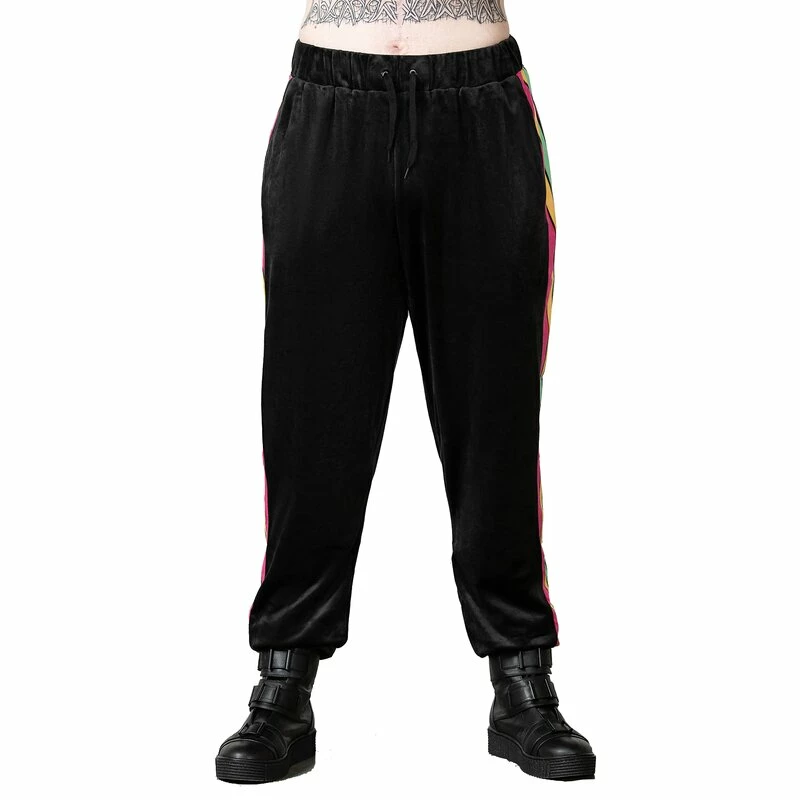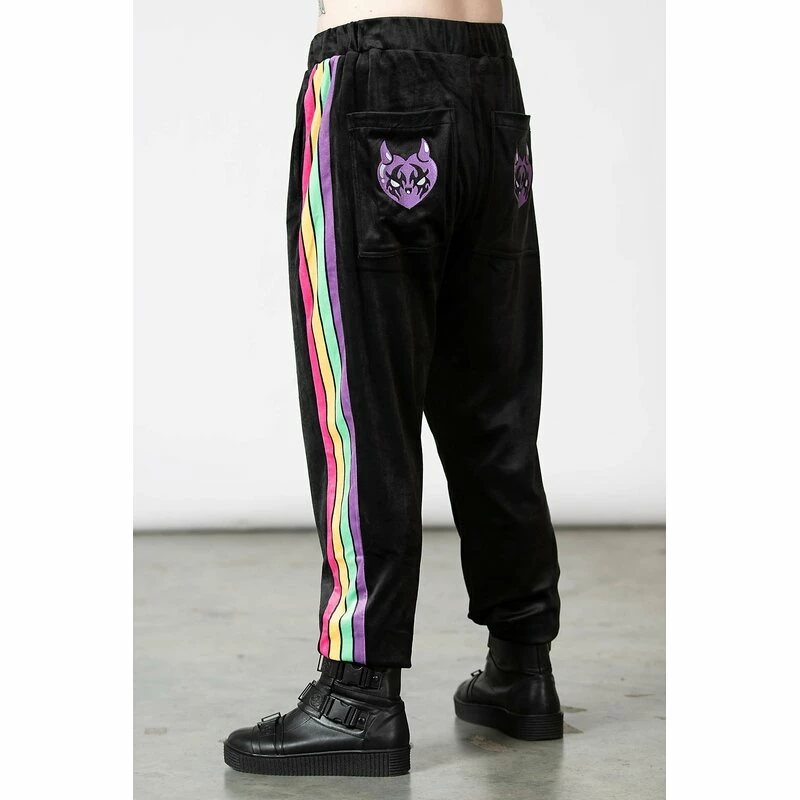 Killstars Lounge Wizard Jogginghose ist aus einem superweichem Samtmaterial, mit einem lockeren Oversized Schnitt.. An den Seiten hat sie pastellfarbene Streifen in Rosa, Gelb, Minzgrün und Flieder. Auf den Gesäßtaschen sind zwei bestickte Herzen mit Teufelshörnern und düsteren Augen.