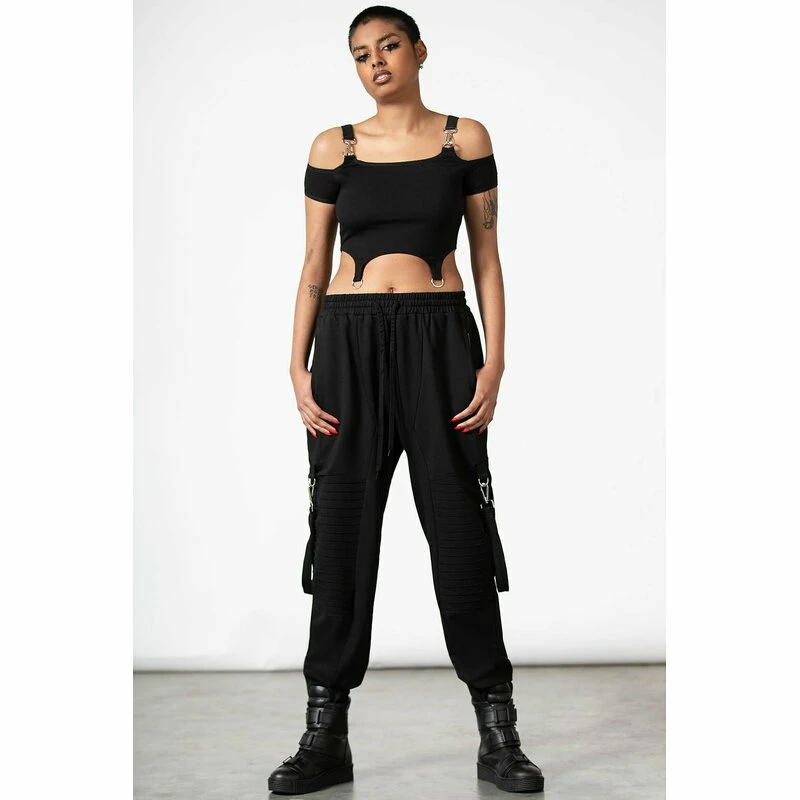 Killstars Scourge Joggers ist eine ultra bequeme Lounge Hose aus reiner Baumwolle. Sie hat eine geriffelte Front und abnehmbare Riemen. Die beiden Seitentaschen haben Reißverschlüsse.