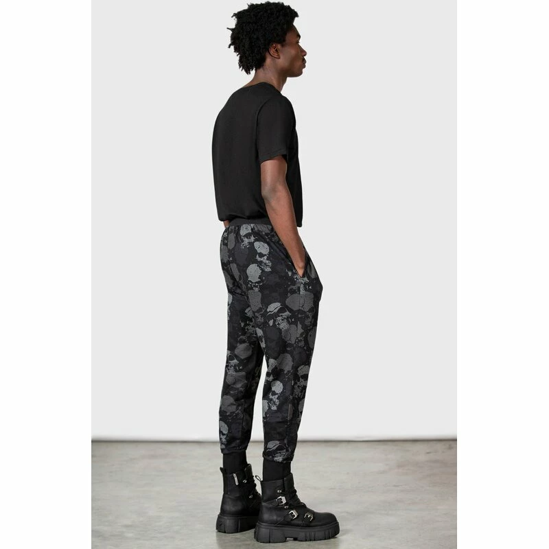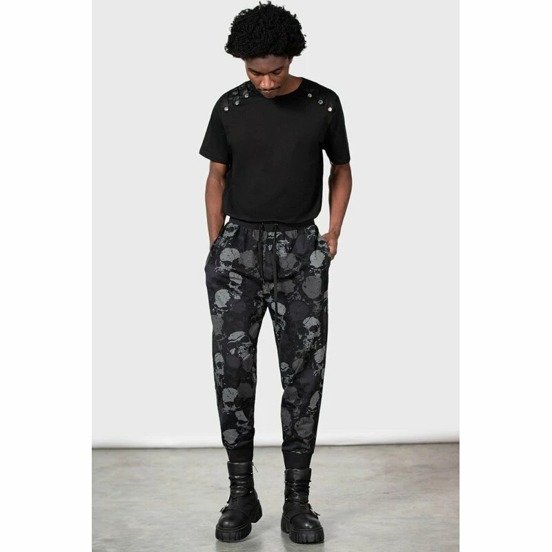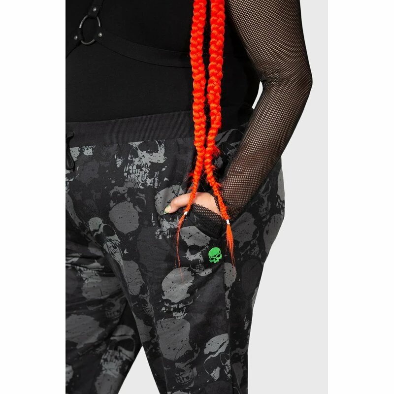 Killstars Tzompantli Muster ist ein Haufen von Schädeln in unterschiedlichen Schwarz- und Grautönen. Die Joggerhose hat einen Tunnelzugbund, zwei Taschen und einen kleinen Print eines neongrünen Schädels.