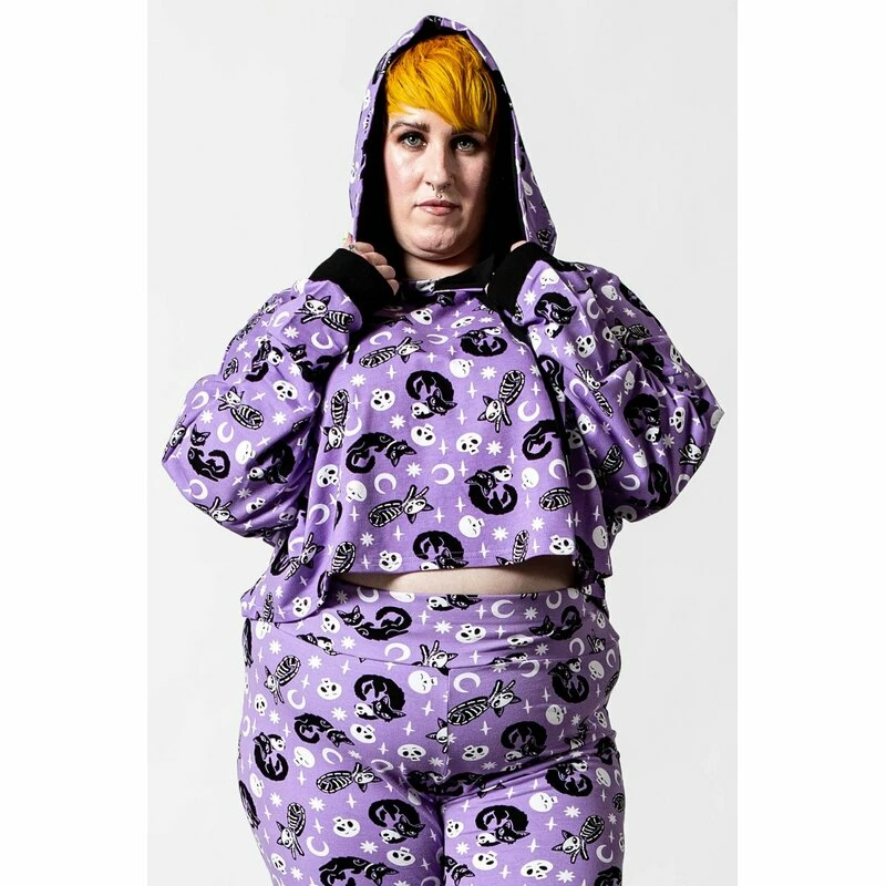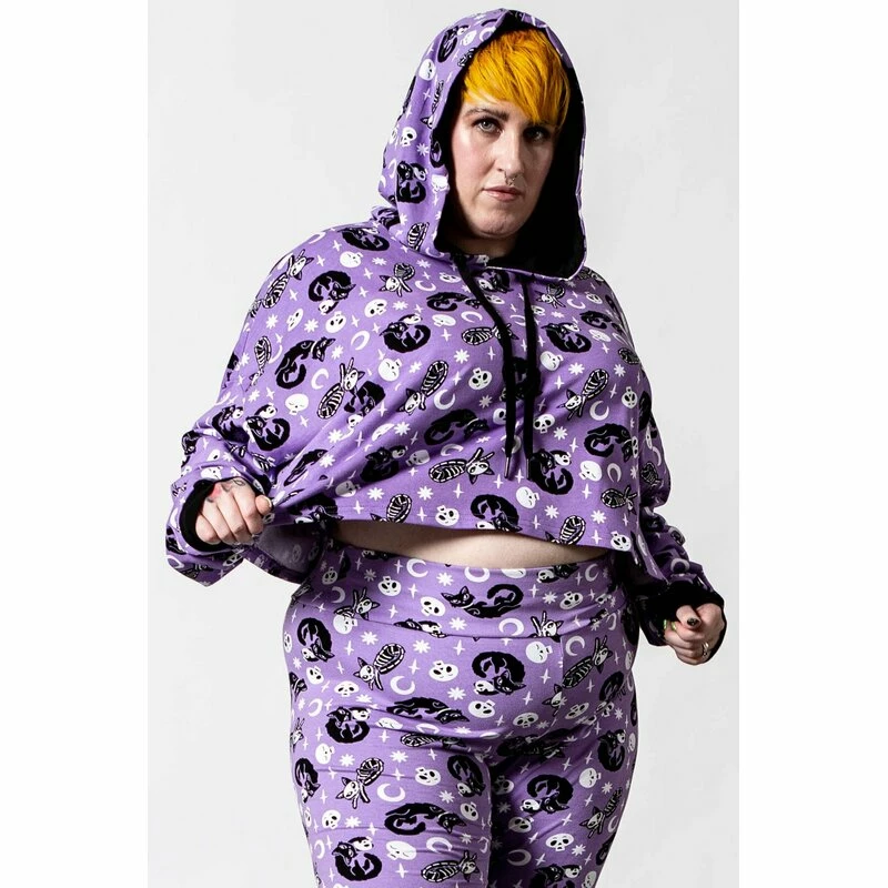 In stillem Gedenken an ausreichend Schlaf. Killstars Purr Off Print besteht aus ganz vielen süßen schwarzen Katzen, Skelettkatzen, putzige Schädel, Sterne und Monde. Der Cropped Hoodie ist aus reiner Baumwolle mit bauchfreiem Schnitt.