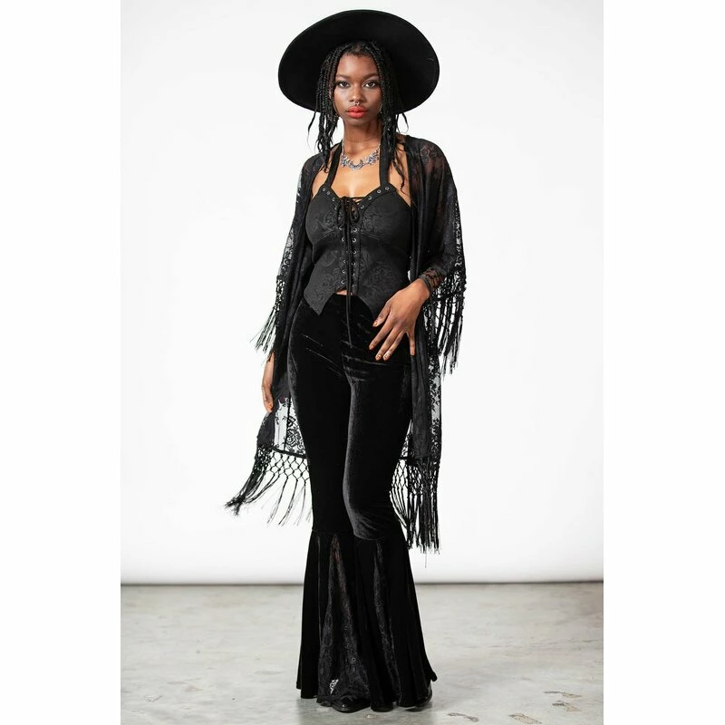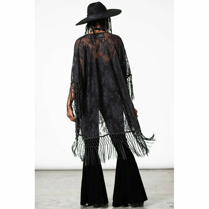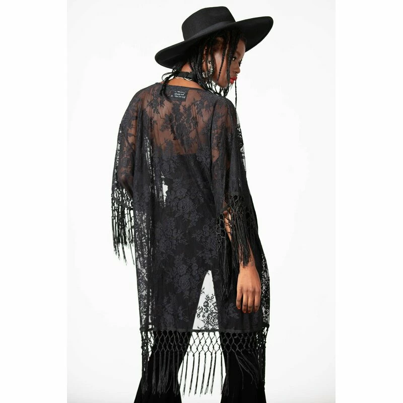 Killstars Witch Hazel Kimono ist aus feiner Spitze mit einem vintage Rosenmuster. An den Säumen hat es lange fransige Quasten. Die Vorderseite ist offen, für einen superbequemen Fit.
