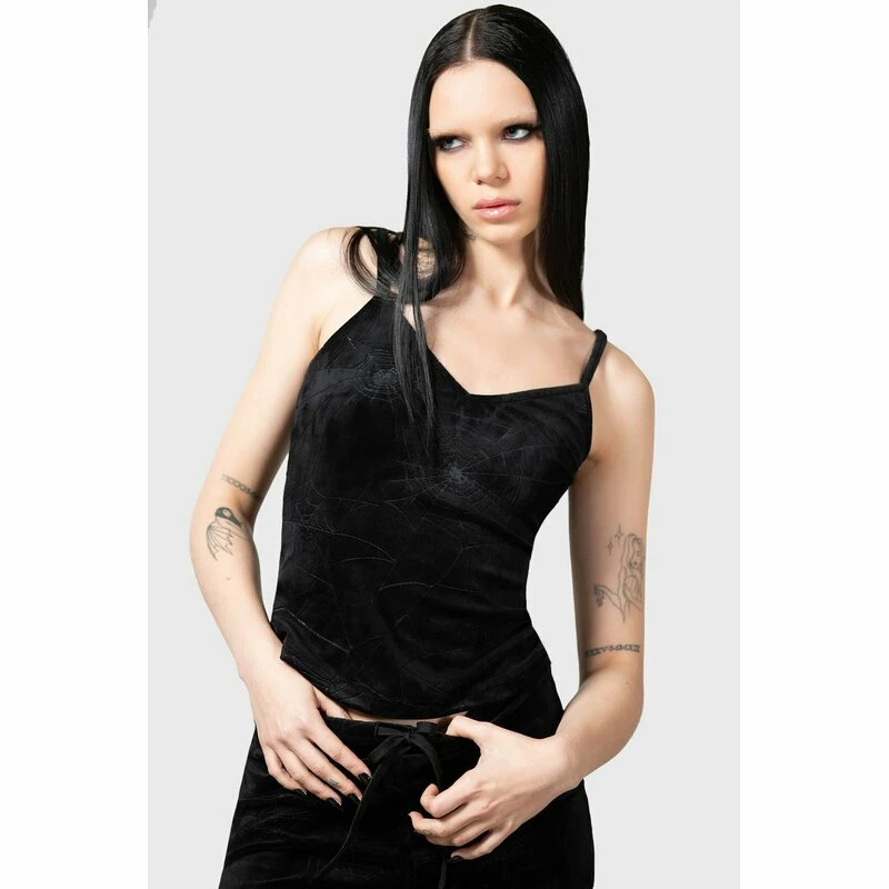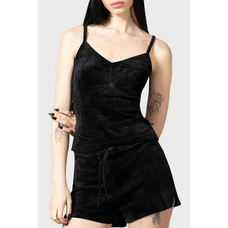 Super kuscheliger Lounge Top von Killstar. Das Eternal Sleeper Leibchen ist aus einem weich samtigen Velours, mit einem geprägten Muster von Spinnennetzen.