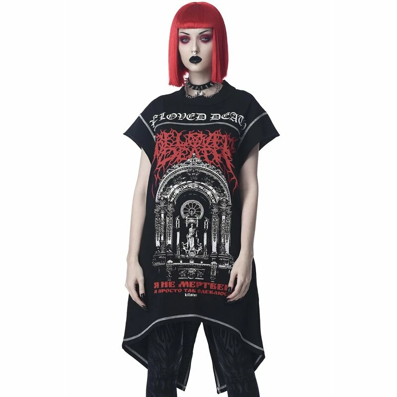 Meine Entspannungsmusik ist Heavy Metal! Killstars Beloved Print zeigt einen Kirchenaltar mit russischem Schriftzug (“Ich bin keine Leiche, ich ziehe mich nur so an”).