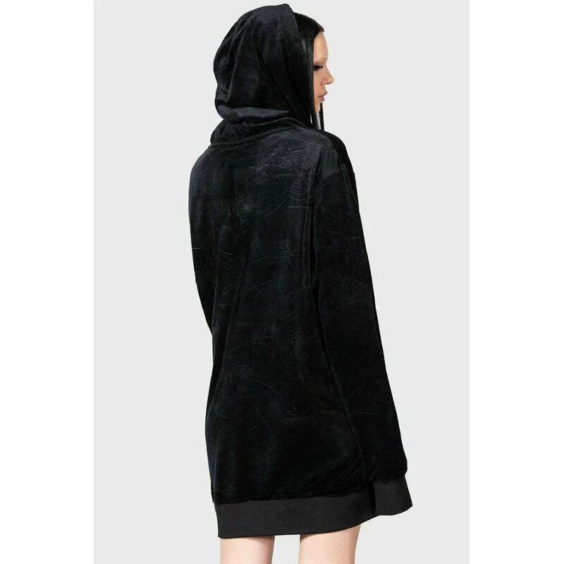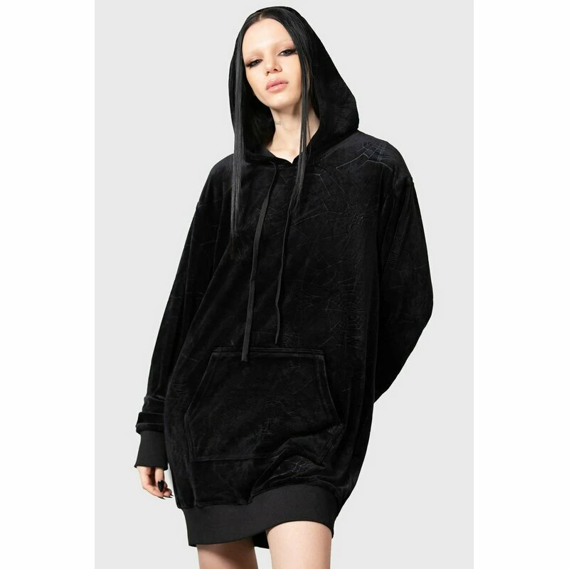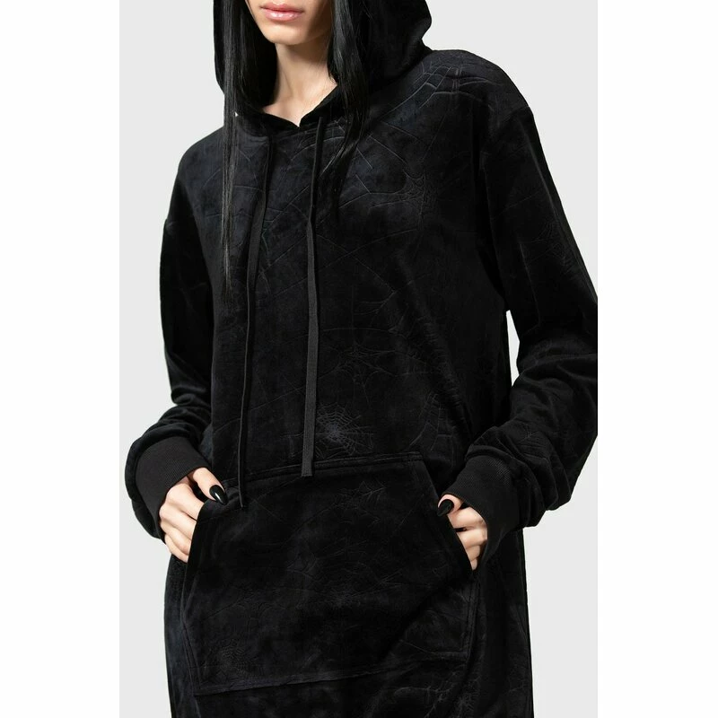 Killstars Webmare Hoodie ist ein extra lang geschnittener Pullover aus samtig weichem Velours. Er hat ein all-over Prägedruck von Spinnennetzen. An der Vorderseite hat er eine Kängurutasche.