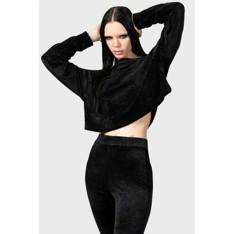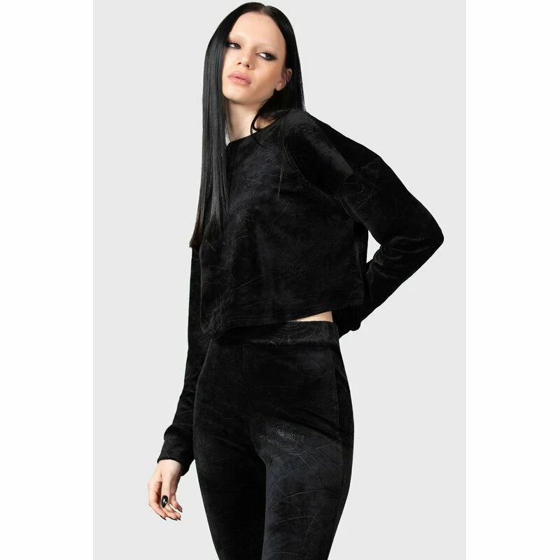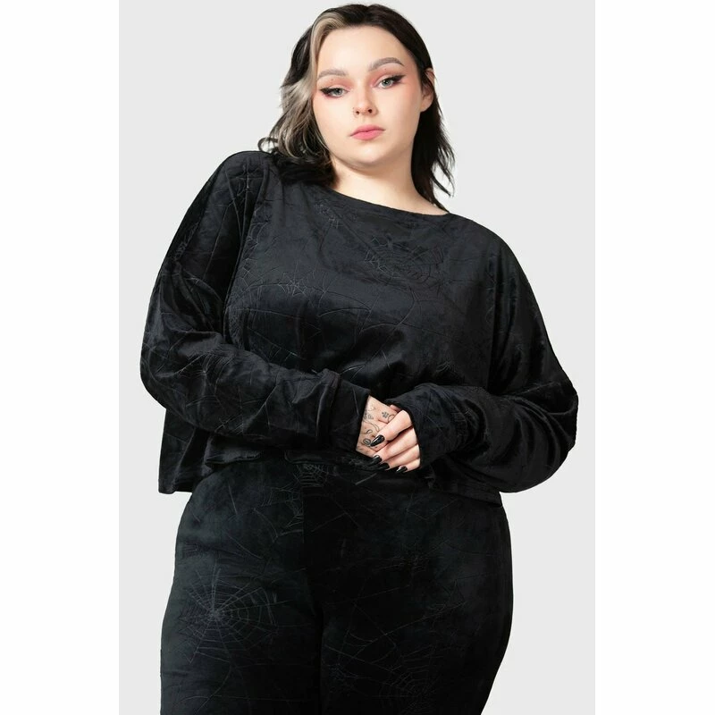 Gekürzter Lounge Pulli von Killstar. Der Lulluspider Pullover ist aus einem weich samtigen Velours, mit einem geprägten Muster von Spinnennetzen.