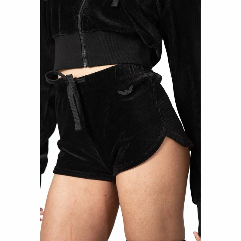 Killstars Laid To Rest Shorts ist aus einem superweichem gerippten Velourstextil. Sie hat einen stretchigen Tunnelzugbund und einen kleinen Fledermaus Anhänger.