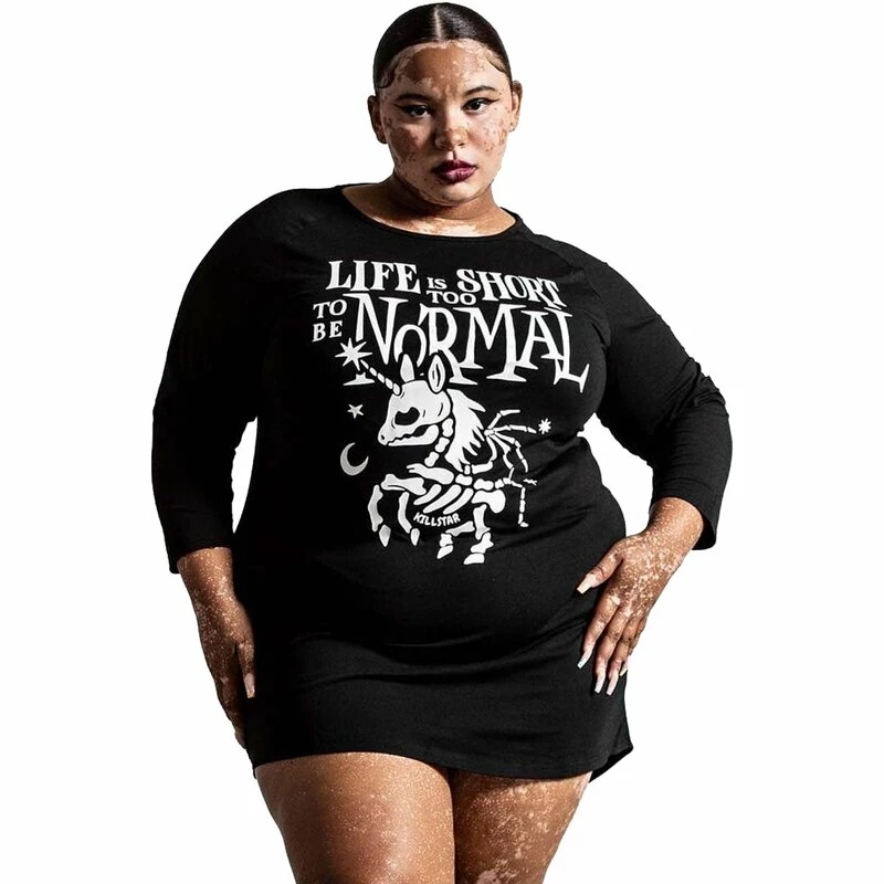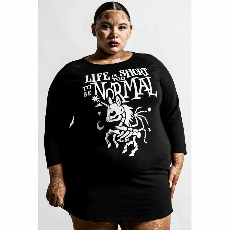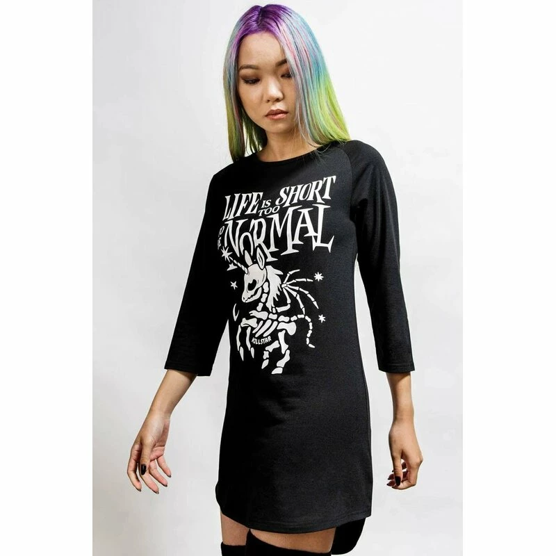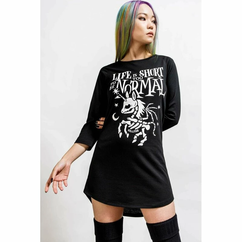 Ich werde schlafen wenn ich tot bin! Killstars Gothicorn Sleep Raglan hat einen Print eines Skeletteinhorns mit “Life’s Too Short To Be Normal” Schriftzug.