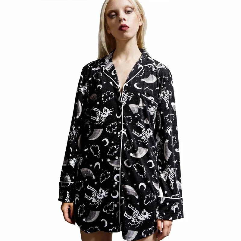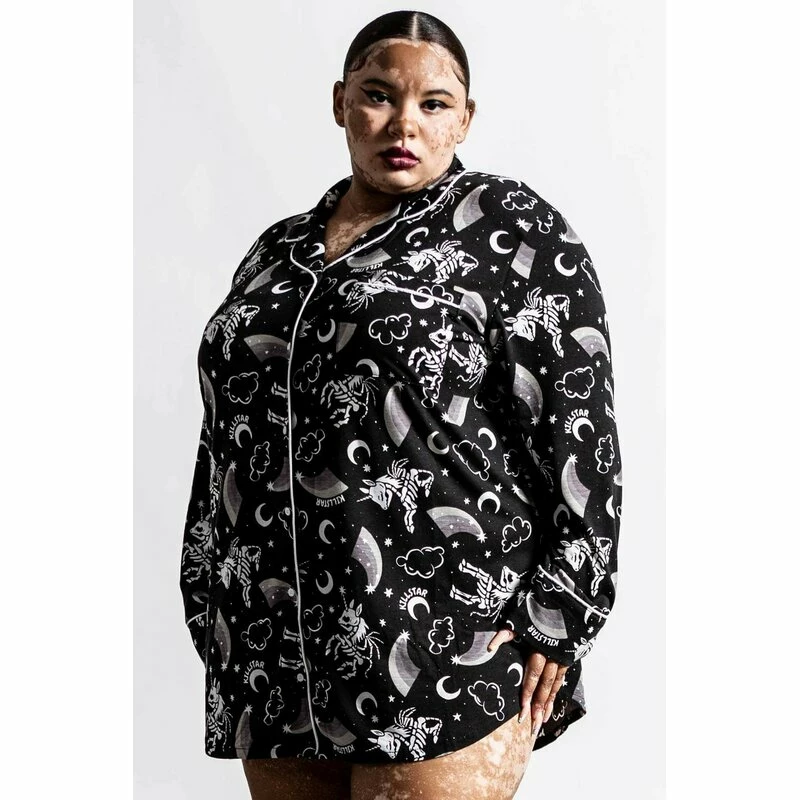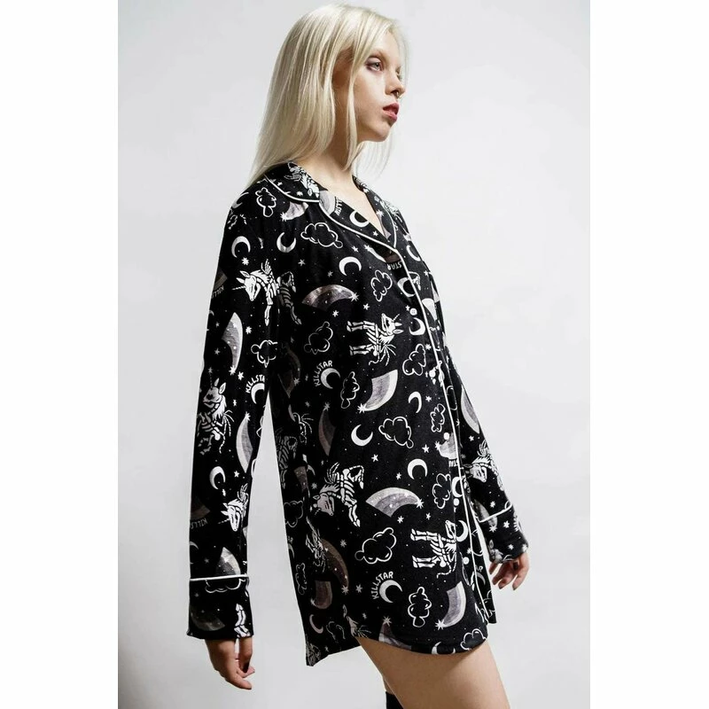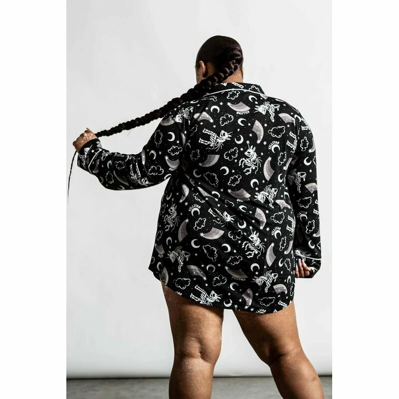 Ich werde schlafen wenn ich tot bin! Killstars Moonbow Schlafhemd hat einen all-over Print des Nachthimmels mit fliegenden Skeletteinhörnern, Sternschnuppen, Sternen, Wolken und Monden