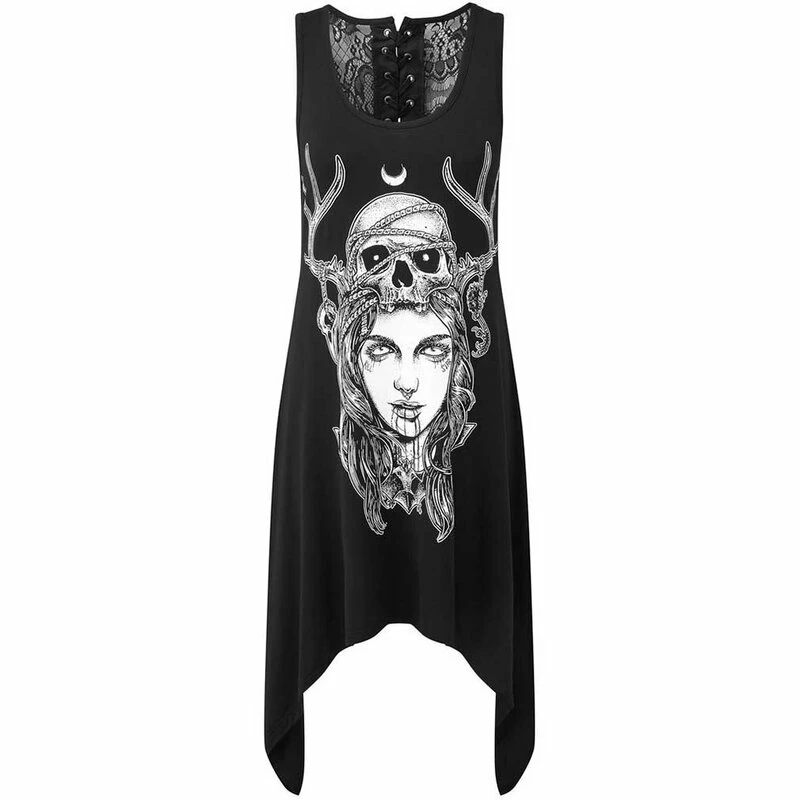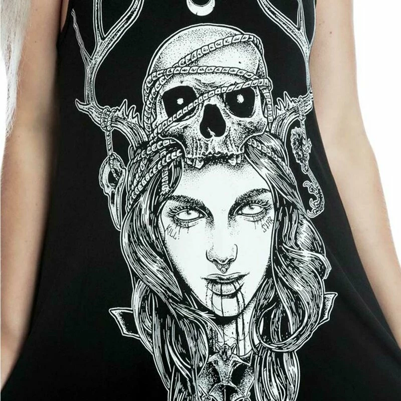 Der Mond hält meine Seele gefangen und ich möchte sie nie wieder zurück haben! Das Moon Magic Vest Kleid ist ein leichtes Tank Top Kleid. Der Rcken ist aus Spitze mit Schnürung. Auf der Vorderseite befindet sich ein Print einer Mondgöttin mit Schädel-Kopfschmuck.