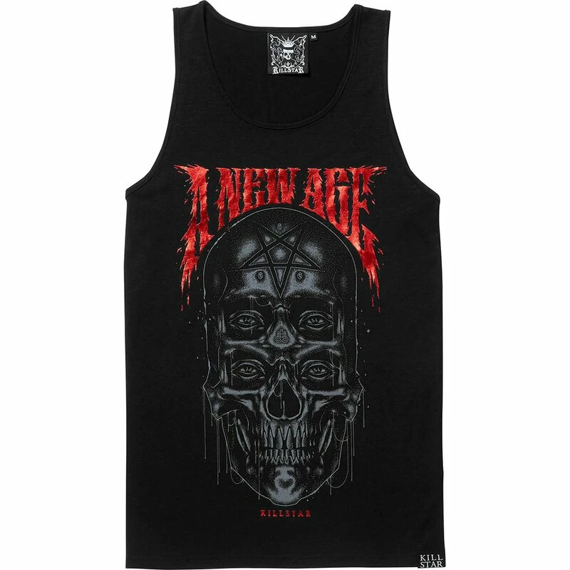 Ein neuer Dimensionenwandel steht an. Killstars New Age Print hat einen glänzenden, metallischen “A New Age” Schriftzug mit okkultem Schädel.