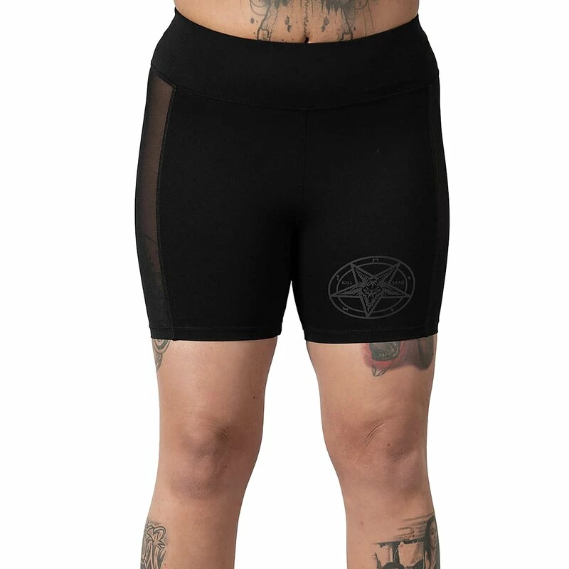 Zählt als Sport, wenn ich zum Kühlschrank renne? Killstars Bad Dream Fitness Shorts sind aus hoch dehnbarem Material, mit Seitenstreifen aus durchsichtigem Mesh. Am linken Bein befindet sich ein bedrucktes Baphomet-Pentagramm.