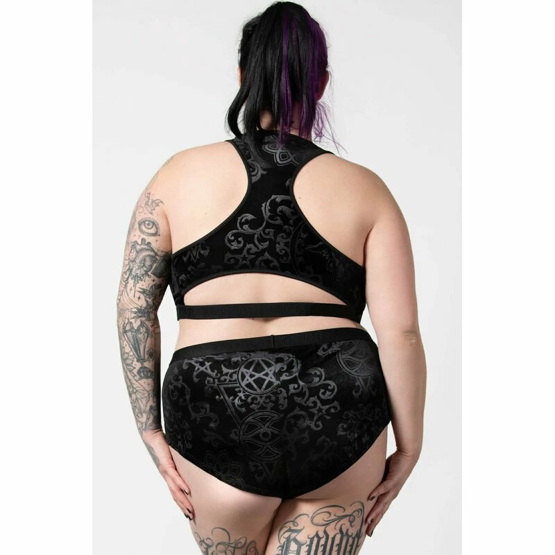 Zählt als Sport, wenn ich zum Kühlschrank renne? Killstars Mortalia Braletl ist aus superstretchigem Material. Es hat ein vintage Muster mit okkulten Symbolen. Die Brust hat herausnehmbare Polster.