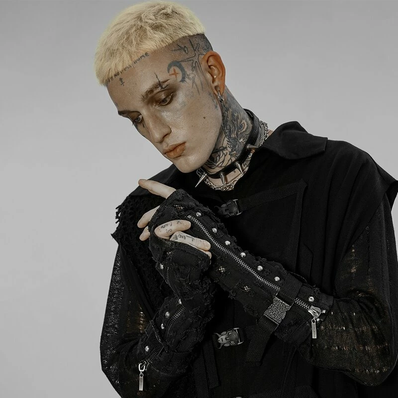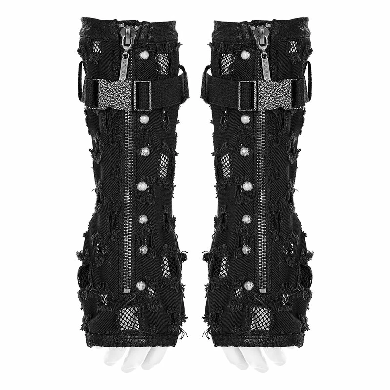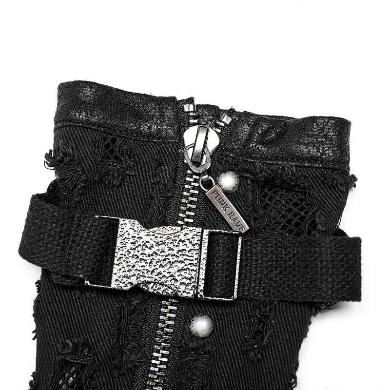Punk Raves Butcher Handschuhe sind auch zerlocht und zerrissenem Denim mit Netz und Kunstleder Kontrasten. Sie haben Reißverschlüsse und metallene Schnallen.