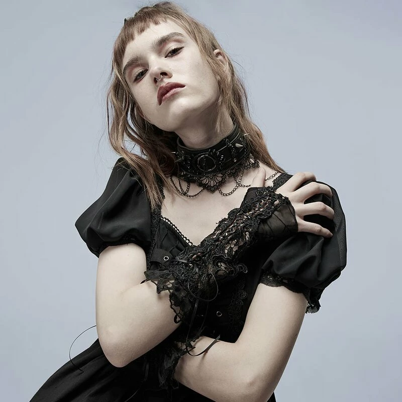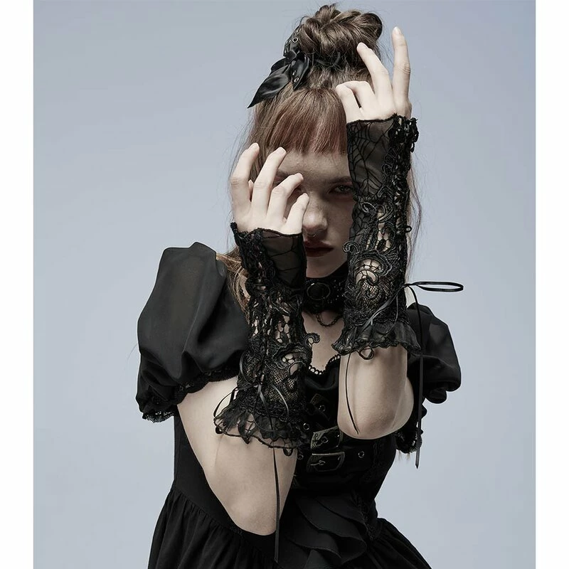 Handschuhe mit Spooky Vintage Vibes von Punk Rave. Die She Passed Away Handschuhe sind aus feiner Spitze mit einem Spinnenetzmuster. Auf der oberen Seite haben sie Zierschnürungen und Applikationen aus Spitze.