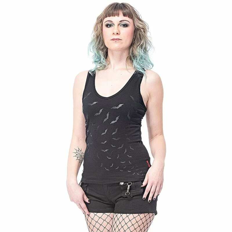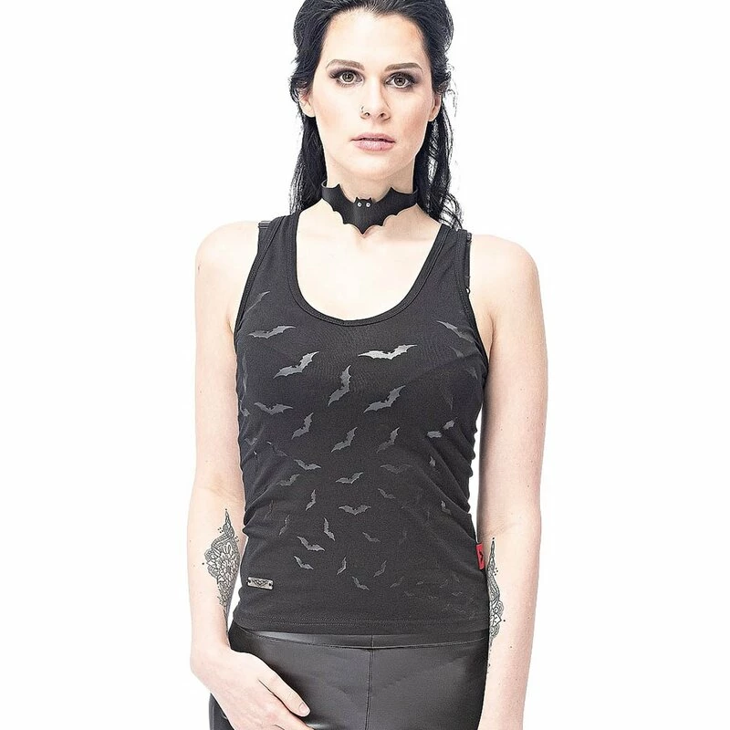 Queen of Darkness’ Bats Top ist ein klassischer Tank Top aus stretchiger Baumwolle. An der Vorderseite hat er einen all-over Print von einem Fledermausschwarm.