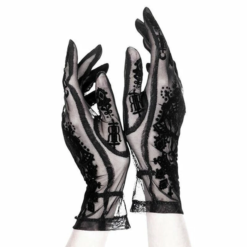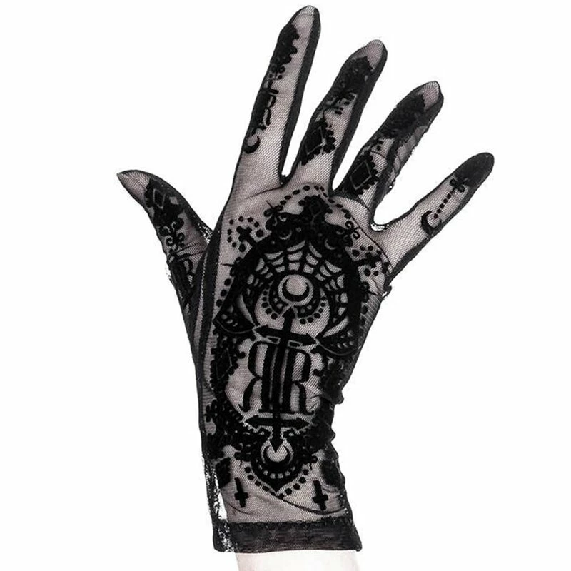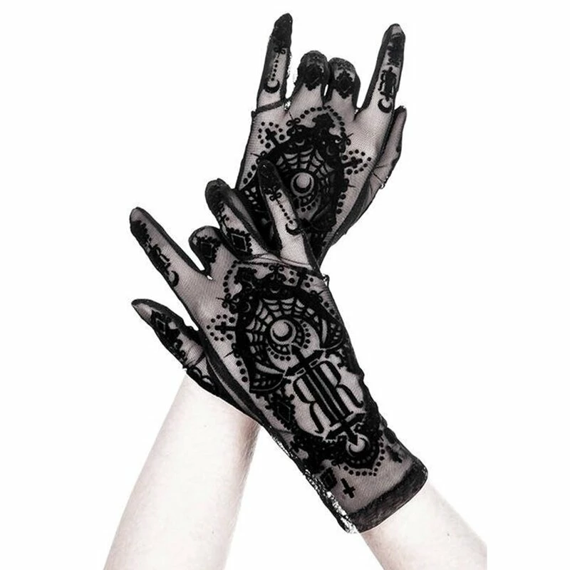 Verpasse deinen Looks einen edlen Touch mit Restyles feinen Handschuhen aus Spitze. Die Saint Handschuhe haben ein detailreiches Muster in der Form eines Kirchenfensters, mit zahlreichen Goth Symbolen wie Kreuze, Mondsicheln, Spinnennetze und Schwefelsymbole.