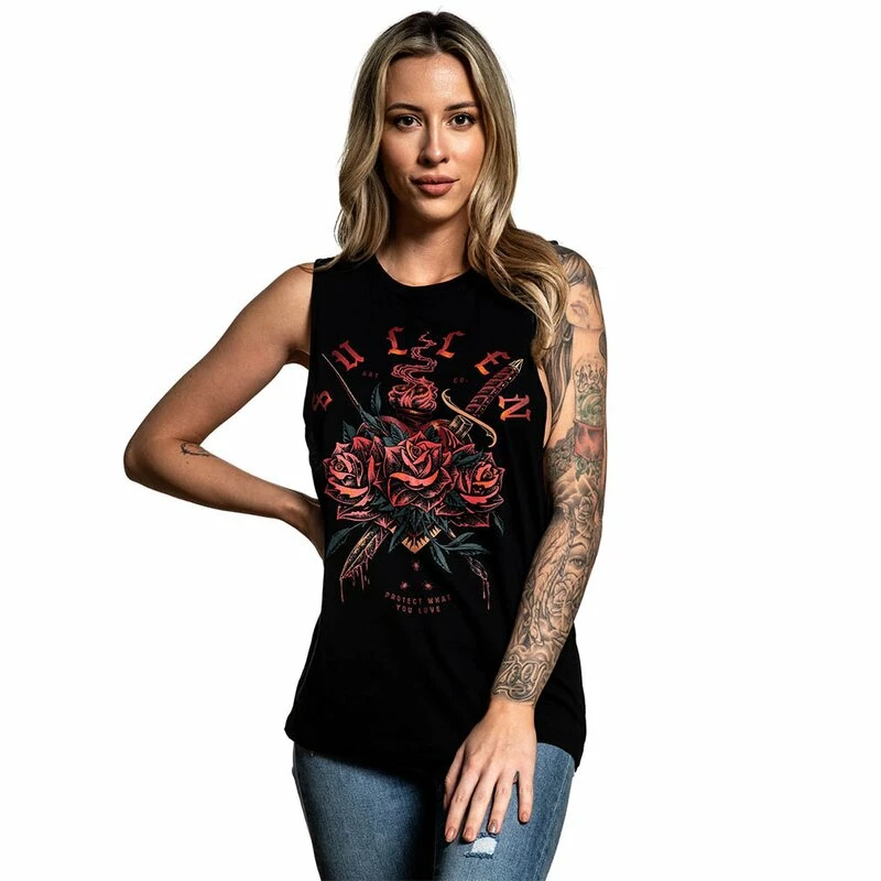 Tank Top mit Batikmuster von Sullen Art Collectives Sullen Angels Kollektion. Das Sacred Oberteil hat einen Print von Rosen mit einem Herz und überkreuztem Schwert und Pinsel.