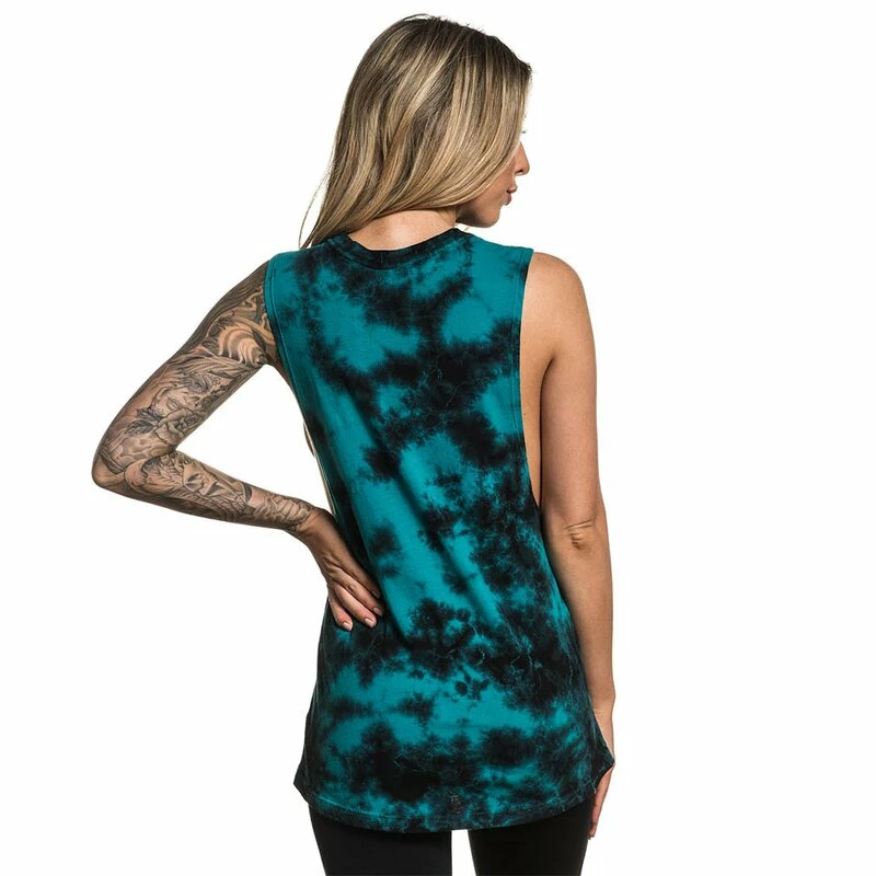 Tank Top mit Batikmuster von Sullen Art Collectives Sullen Angels Kollektion. Der Print zeigt eine farbenfrohe Interpretation des SAC Logos, mit einer fantasievollen Szene einer tätowierten Dame, einem Segelschiff und weiteren Tattoo-inspirierten Symbolen.